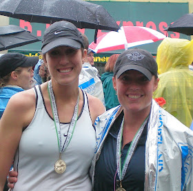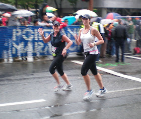 I finally looked up from the rivers running down the street and spotted the familiar Running Skirt with butterflies!!! It was Mel and Jill!!!  HOORAY!!!  They hollered and I waved!  I shouted, “When will I see you again?” “Mile 12!”